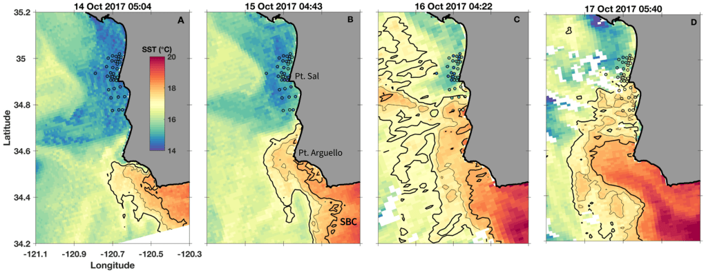 Many coastal buoyant plumes are less dense than the shelf waters because they are relatively fresh (less salty). However, coastal plumes can also be thermally driven. In central California, water in the Santa Barbara Channel is relatively warm compared to waters outside the channel and after a wind relaxation event, when typically down-coast winds slow down or reverse, these warm waters can exit the channel and propagate up-coast as a plume. This has been studied before (Washburn et al. (2011) and Suanda et al. (2016)), but we were recently able to provide new insight about the far field evolution of this plume after an array of 42 moorings captured the plume propagation in 2017!